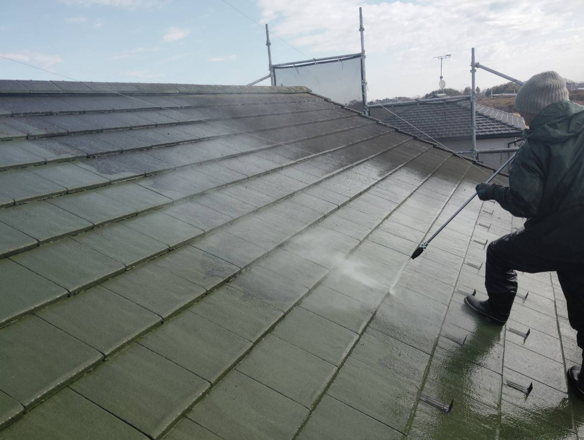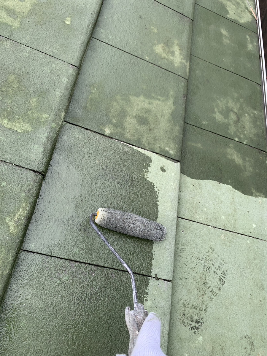 セメント瓦は吸水性が高いため、下塗りを吸い込みが止まるまで入念に行う必要がある。