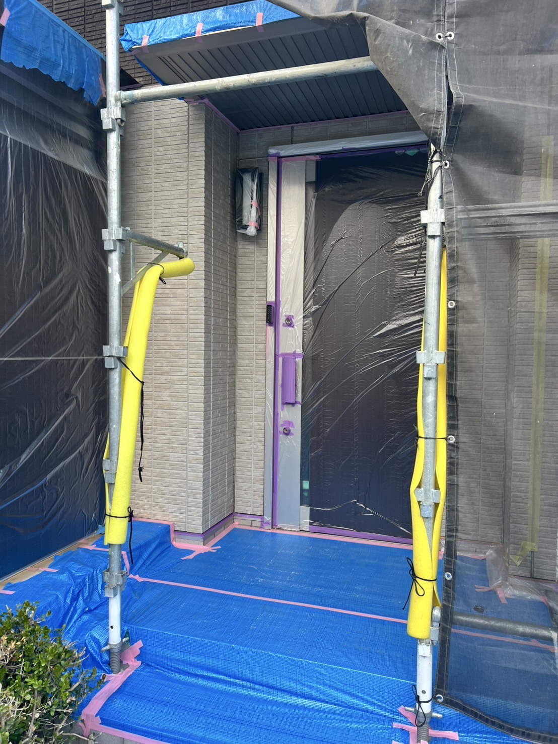 クリヤー塗装は基本的に2工程です。外壁へ他の塗料が付かないようにしなければならない為、塗りつぶしの塗装に比べて緊張感が高まります。