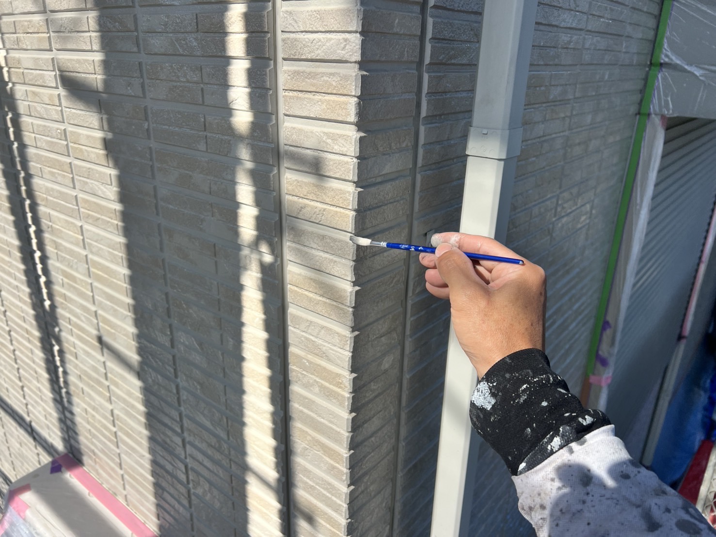経年劣化による塗膜の剥離などを、既存外壁材の近似色でタッチアップしていきます。タッチアップをしないままクリヤー塗装をしてしまうと剥離部分だけが目立ってしまい美観を損ねてしまいます。