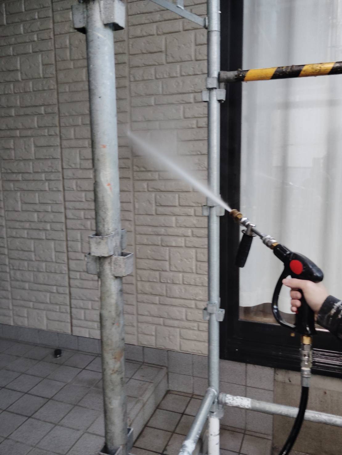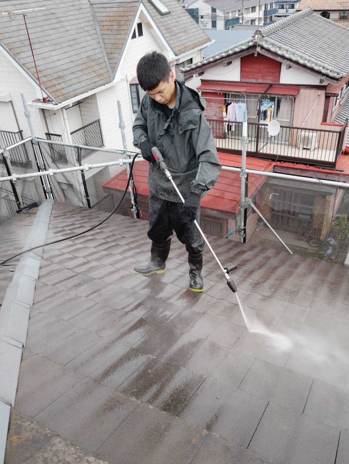 エンジン式の高圧洗浄機を使用し、外壁・屋根についた汚れを丁寧に落としていきます。