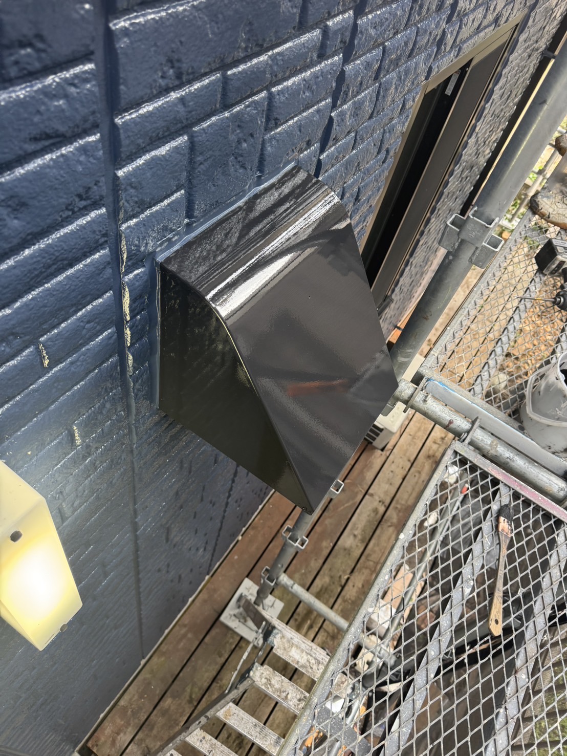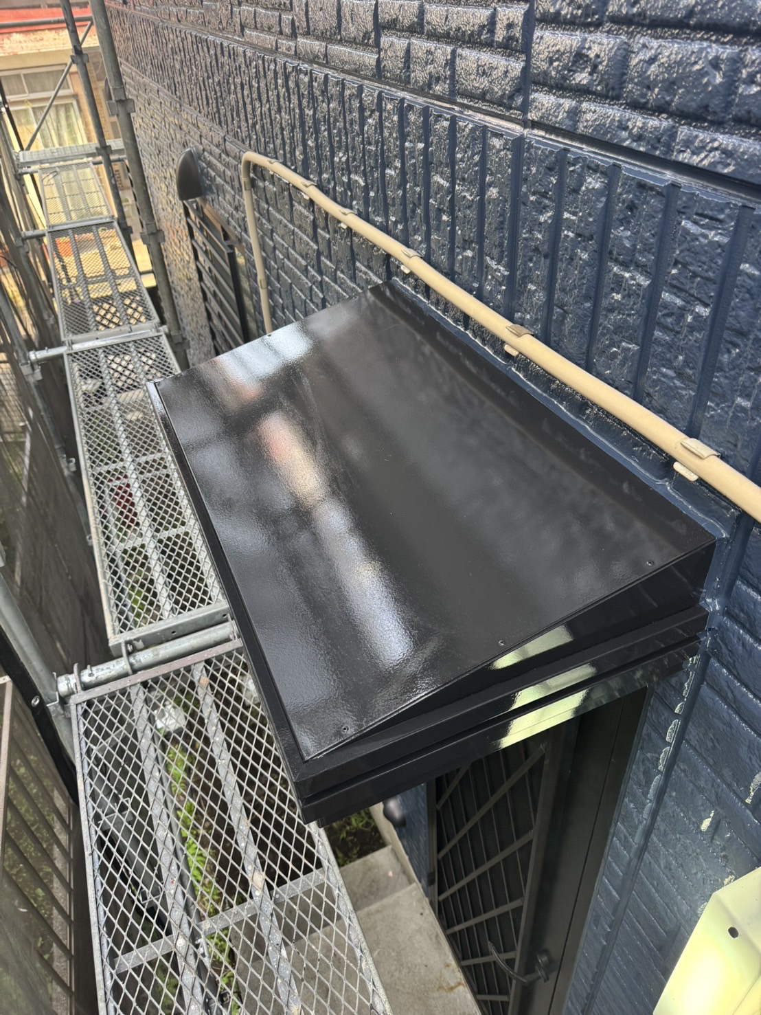 庇は、鉄製、ガルバ銅板、銅板など素材は様々です。錆がある場合はケレンで錆を除去し、錆止めを入れ、その上から塗装をしていきます。