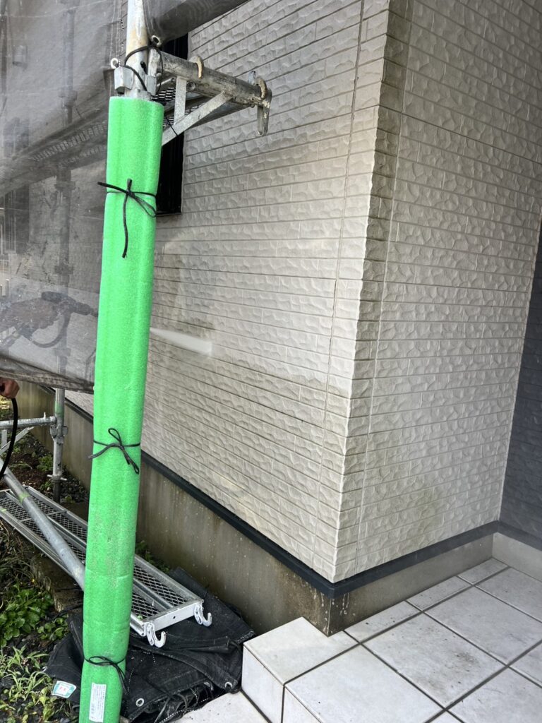 エンジン式の高圧洗浄機を使用し、外壁・屋根についた汚れを丁寧に落としていきます。