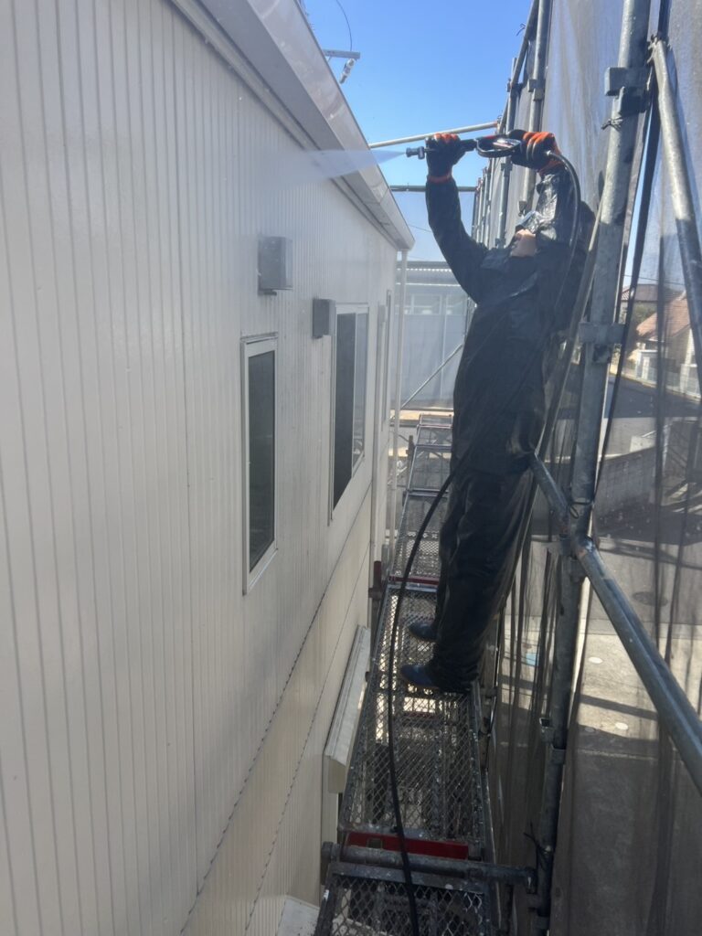 エンジン式の高圧洗浄機を使用し、外壁・屋根についた汚れを丁寧に落としていきます。