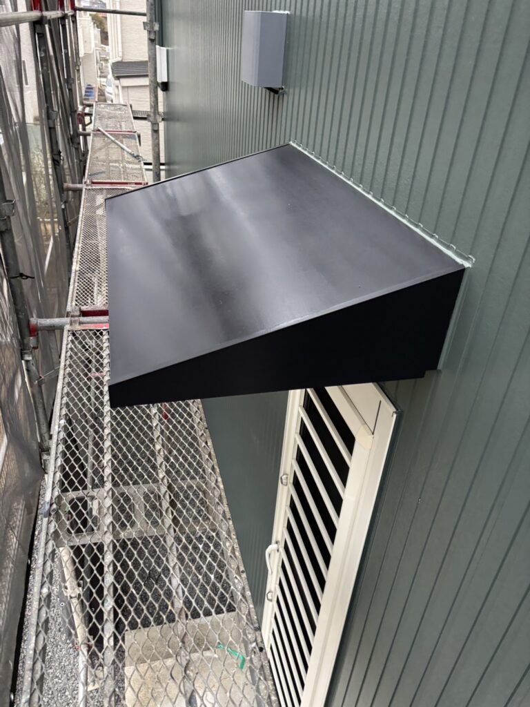 庇は、鉄製、ガルバ銅板、銅板など素材は様々です。錆がある場合はケレンで錆を除去し、錆止めを入れ、その上から塗装をしていきます。