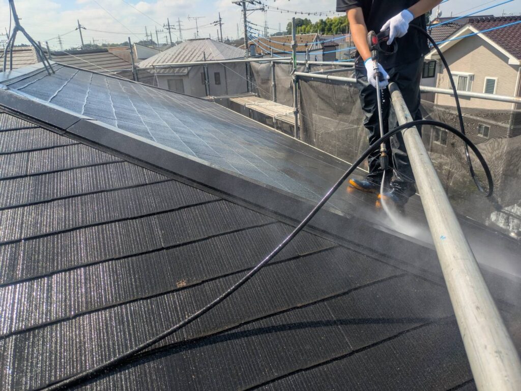 エンジン式の高圧洗浄機を使用し、外壁・屋根についた汚れを丁寧に落としていきます。