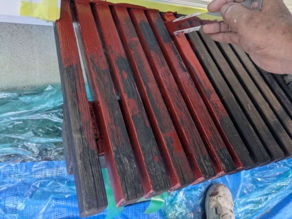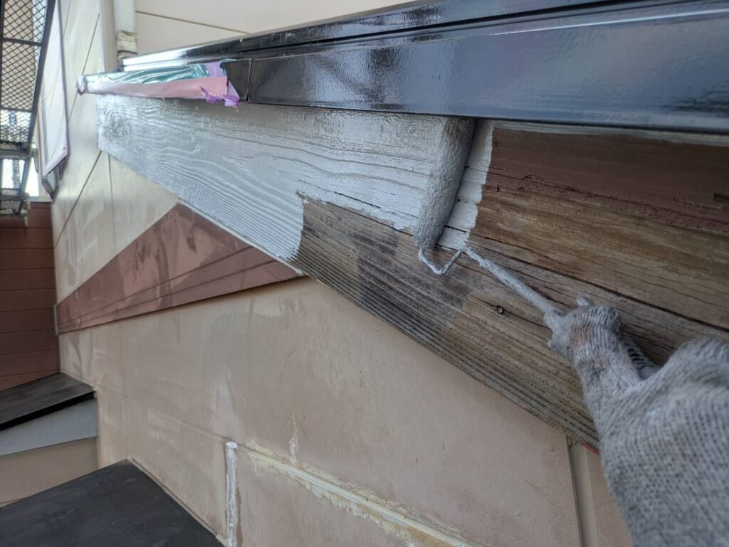 木製の破風で傷みの酷い場合は、専用プライマー、錆止めなどを使用してしっかり補強をしていきます。あまり目につかない箇所ですが、職人はどの箇所も丁寧にしっかりと仕上げていきます!