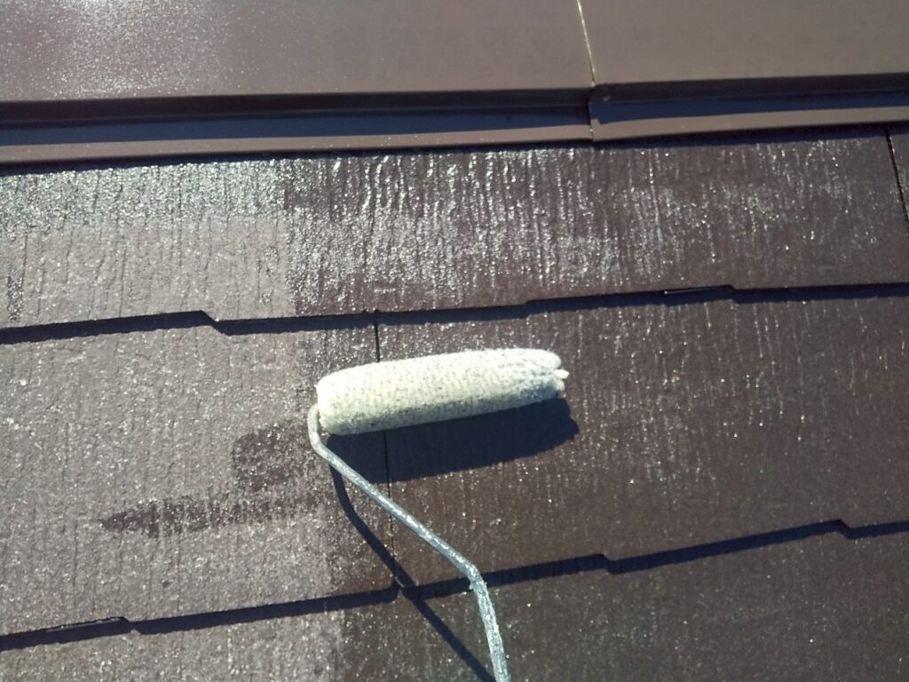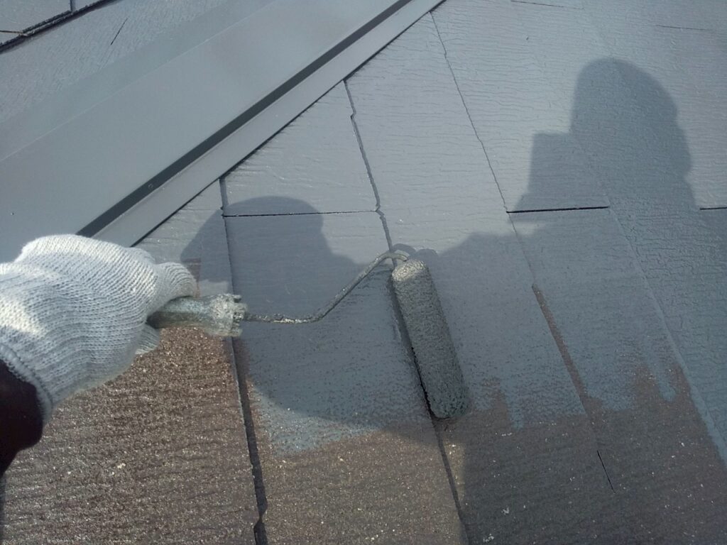 下塗りが十分に乾いたら、中塗りを塗布します。ご自宅の中で一番高い位置の塗装となるので、屋根は特に細心の注意を払って作業をしていきます。